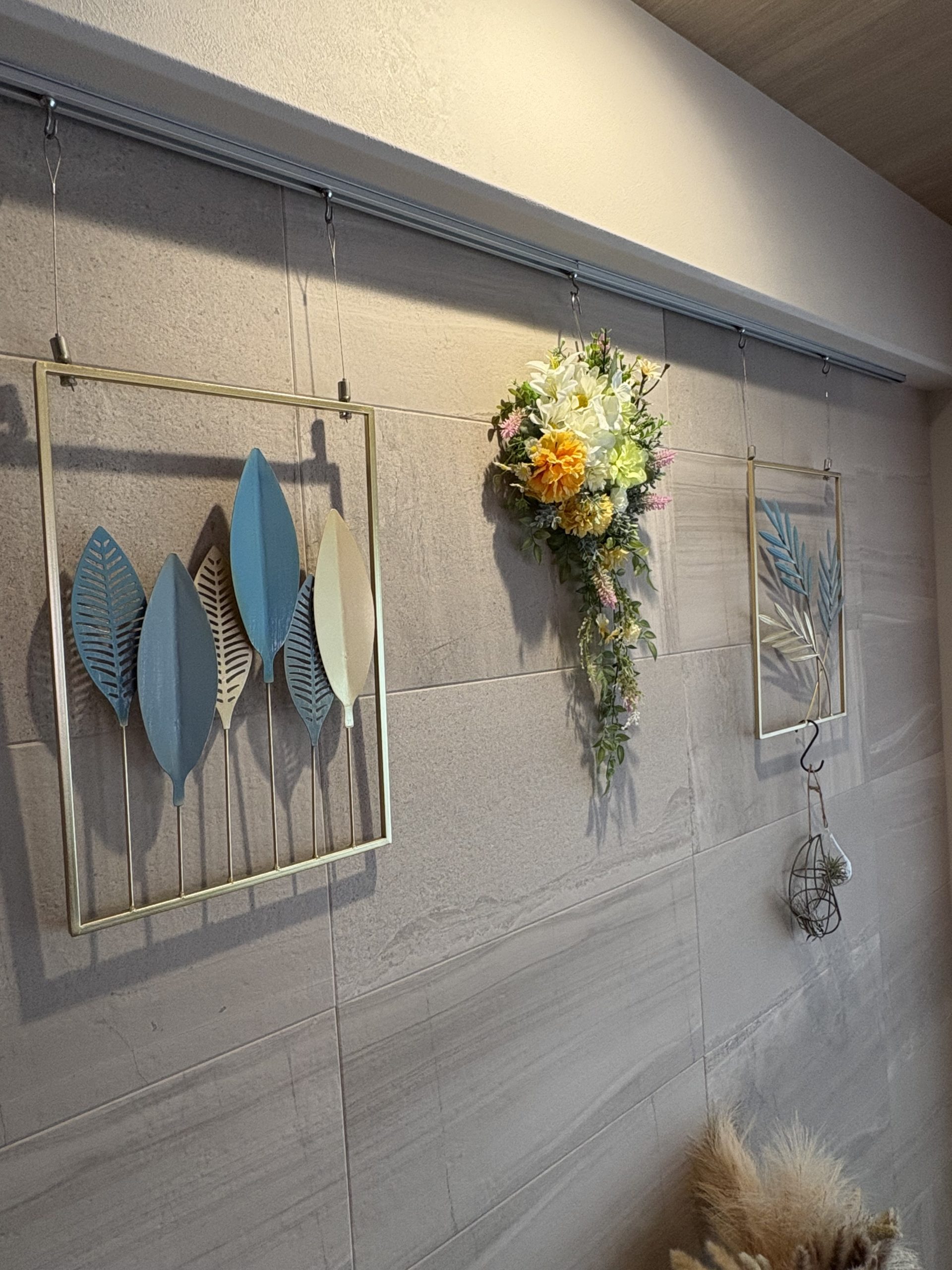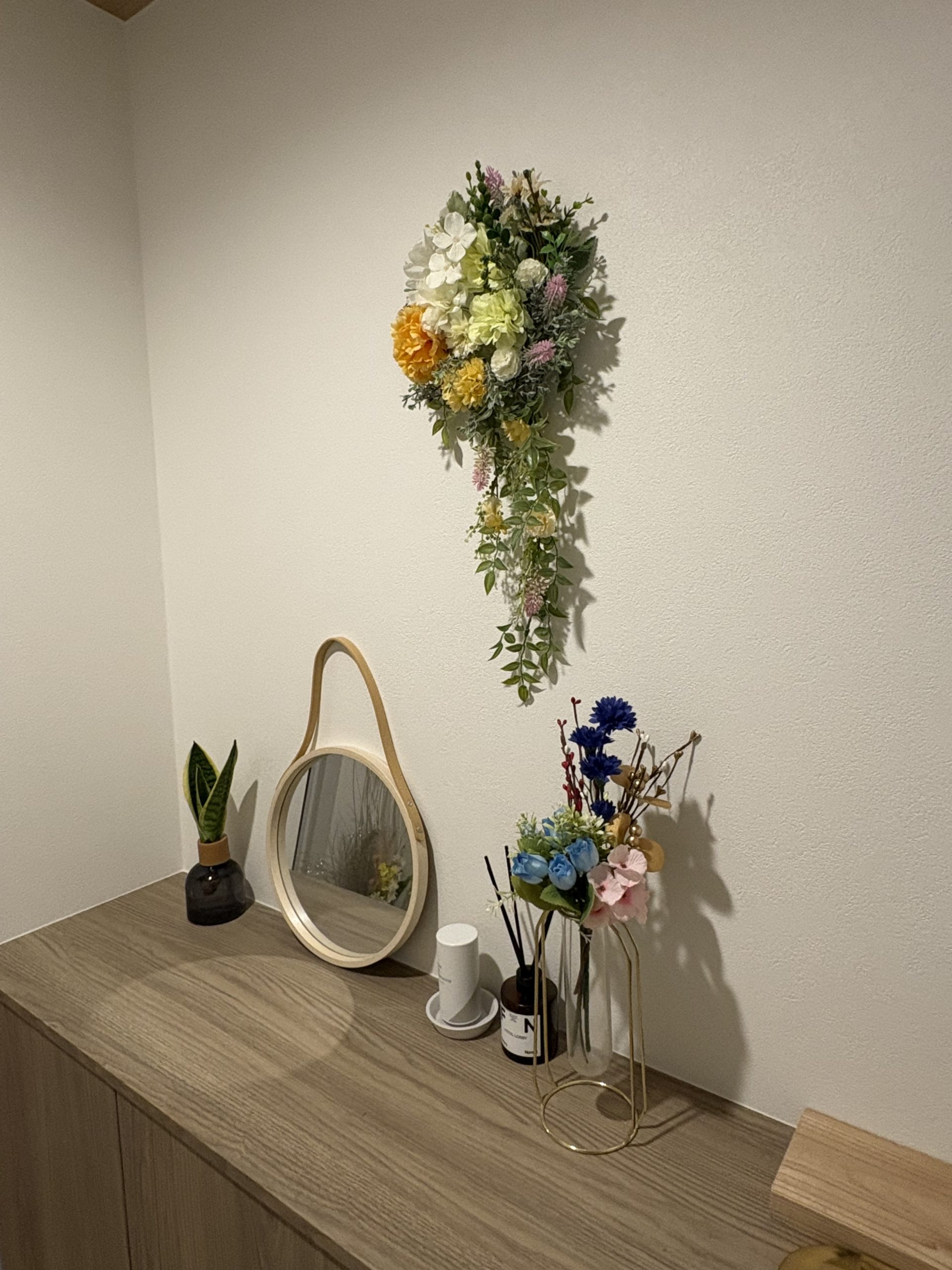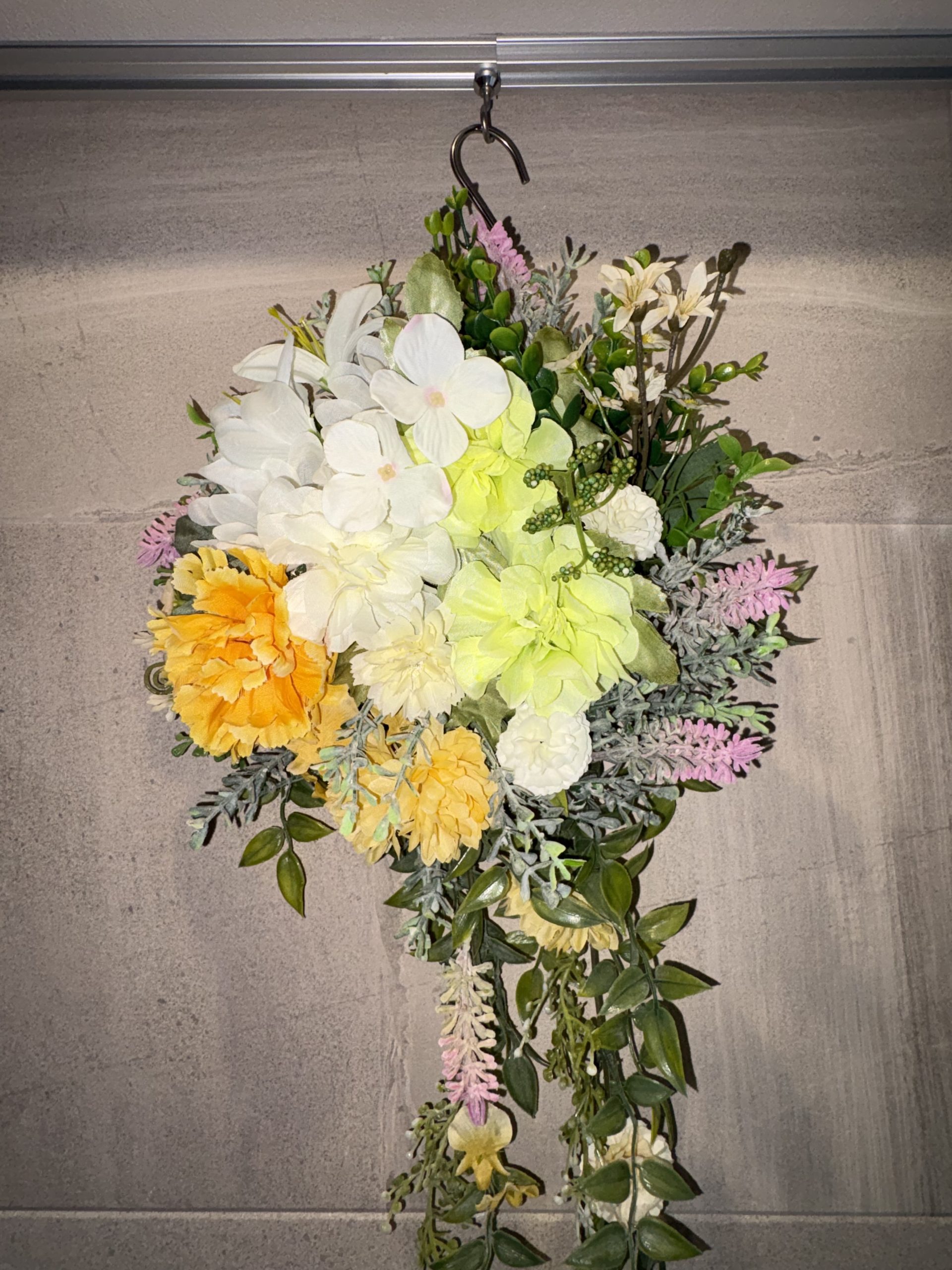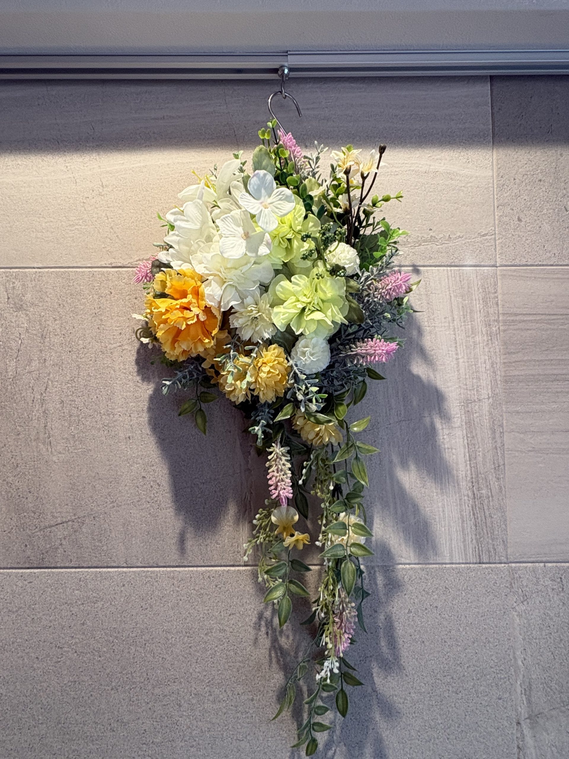 一番の魅力は、55cmというロングサイズを活かした「しだれる」デザイン。壁に飾ると、美しい花々とグリーンが風に揺れるように視線を下に誘導し、空間に優雅な奥行きと高さをもたらしてくれます。