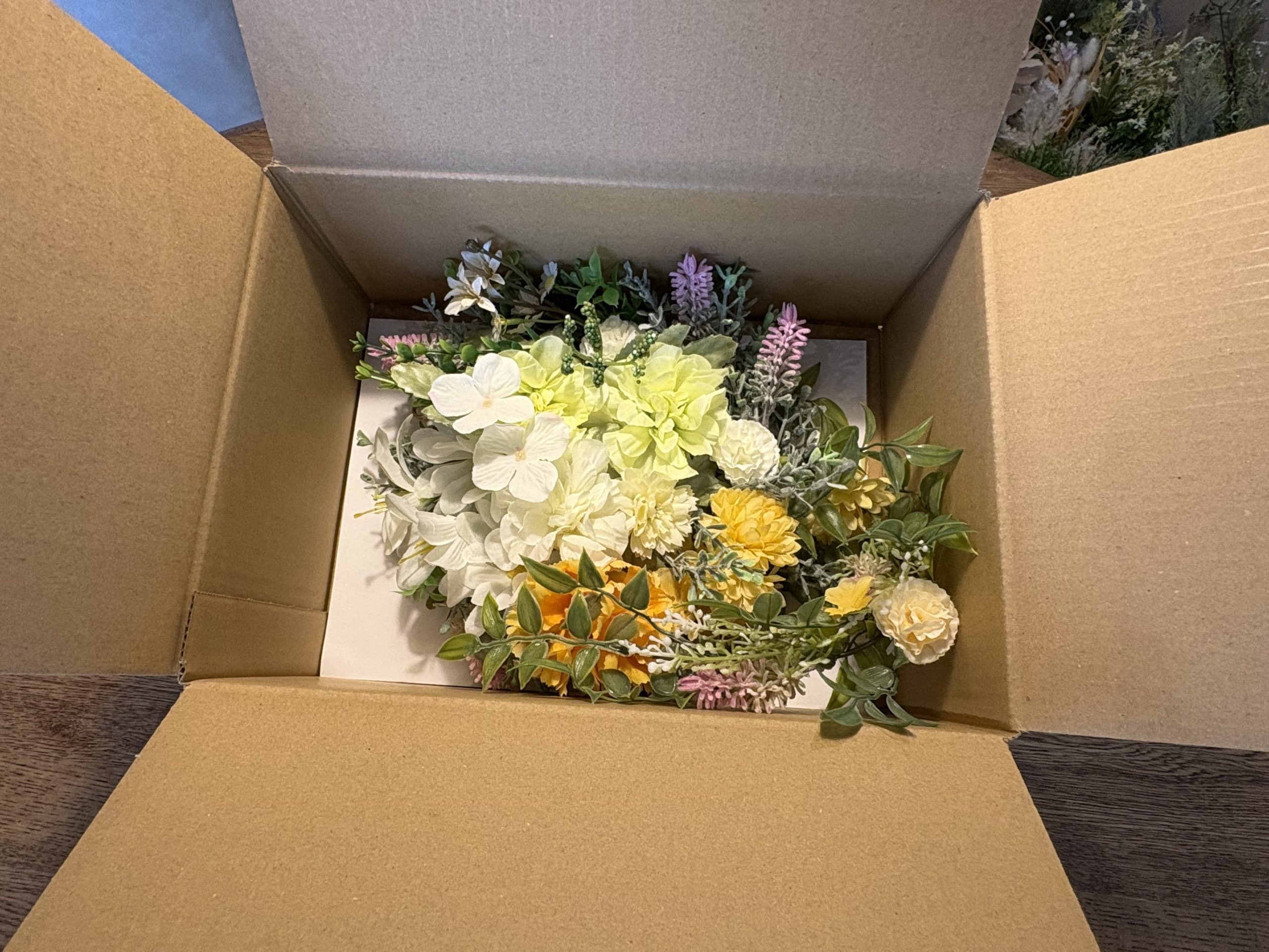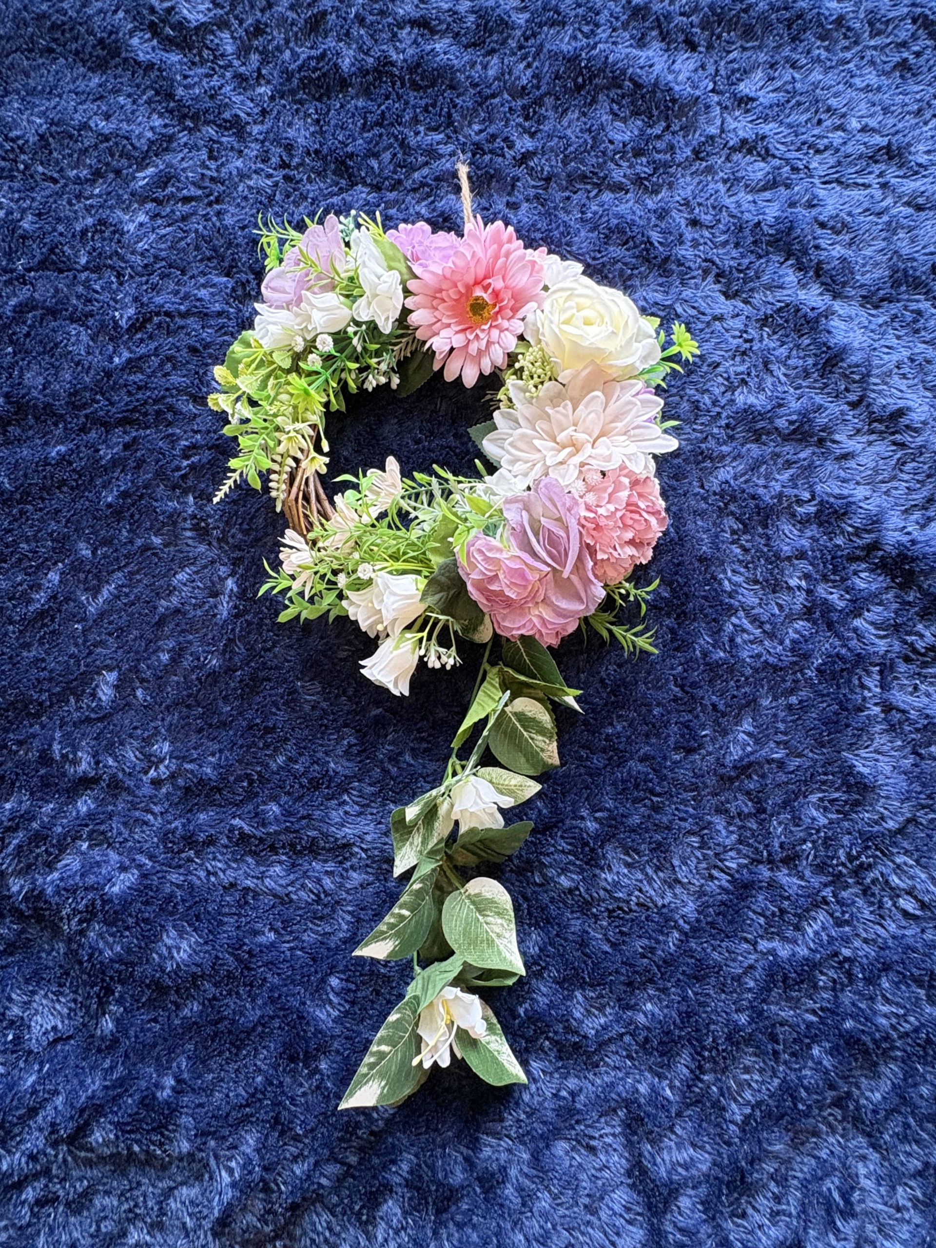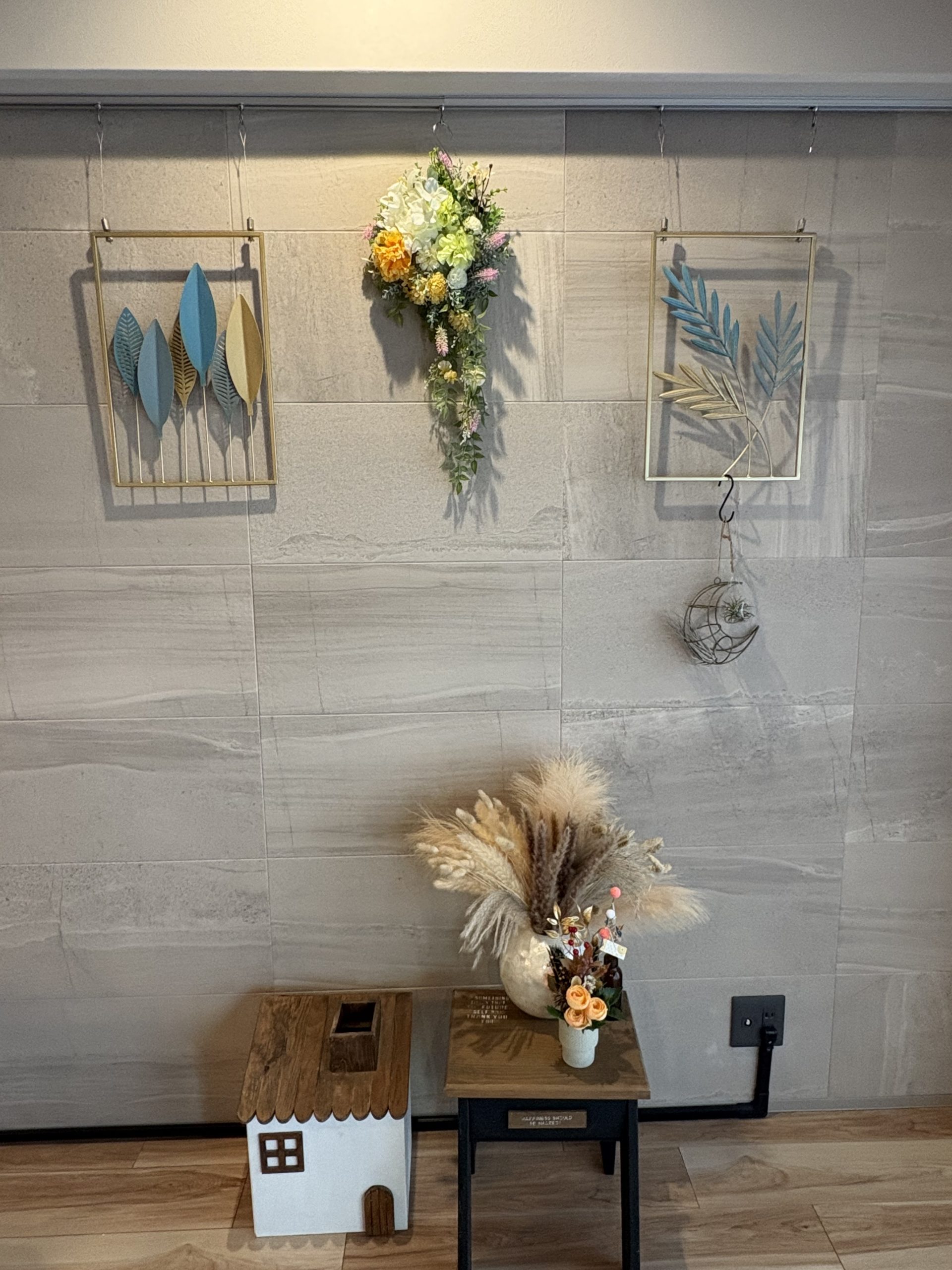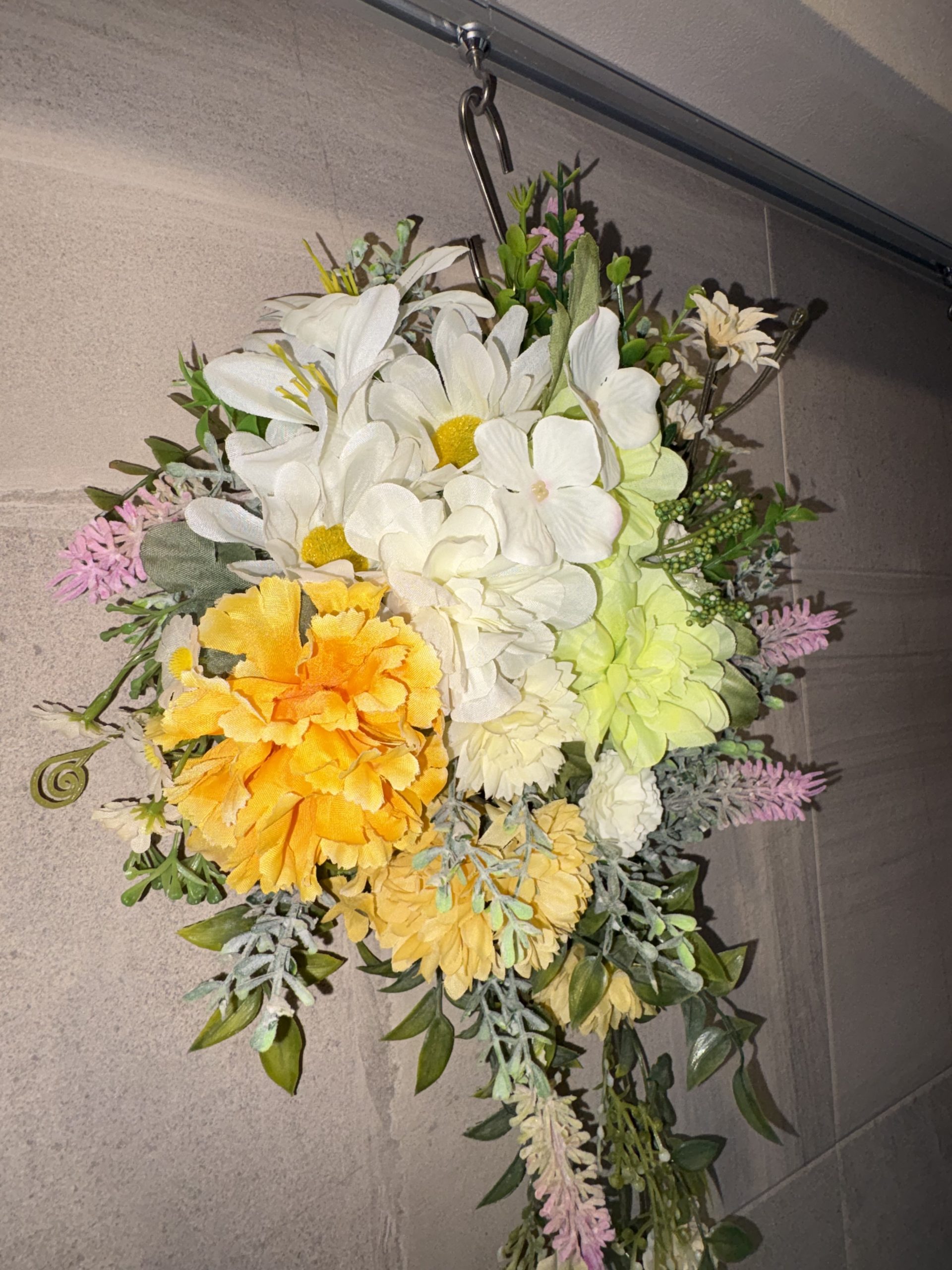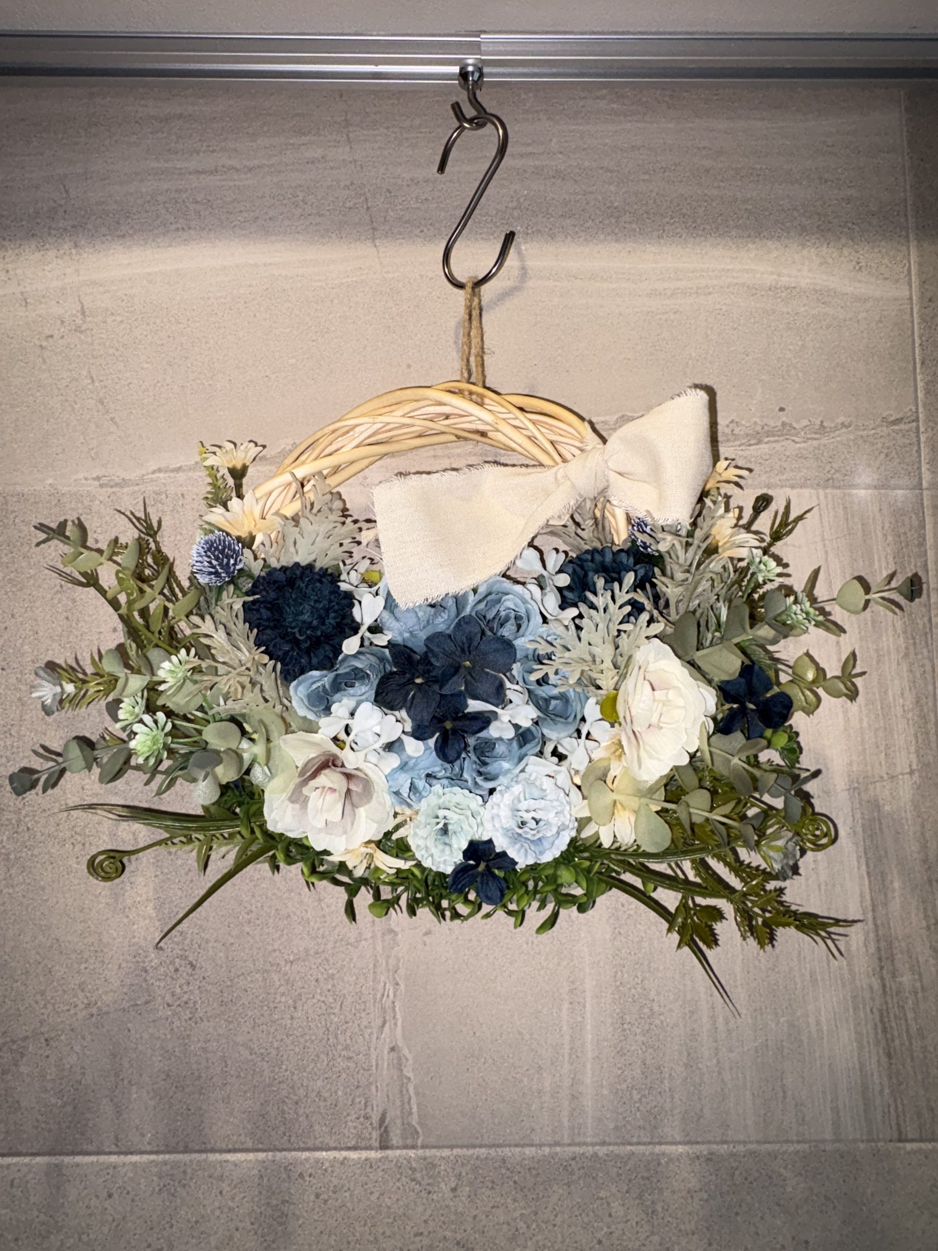 一番の魅力は、55cmというロングサイズを活かした「しだれる」デザイン。壁に飾ると、美しい花々とグリーンが風に揺れるように視線を下に誘導し、空間に優雅な奥行きと高さをもたらしてくれます。