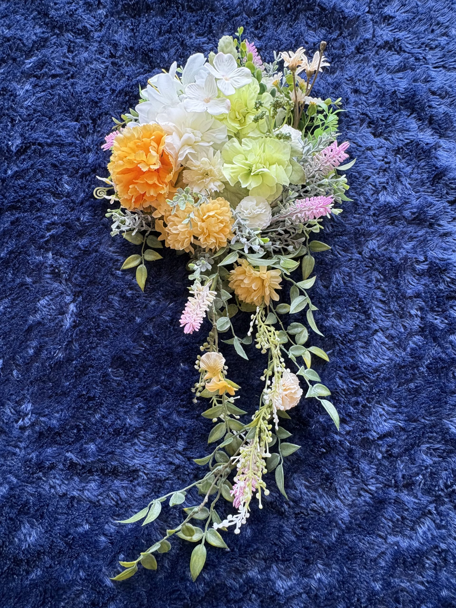 溢れんばかりのオレンジと瑞々しいライムグリーン。 まるでお庭の草花を贅沢に束ねたような、縦長ラインが美しいナチュラルスワッグです。