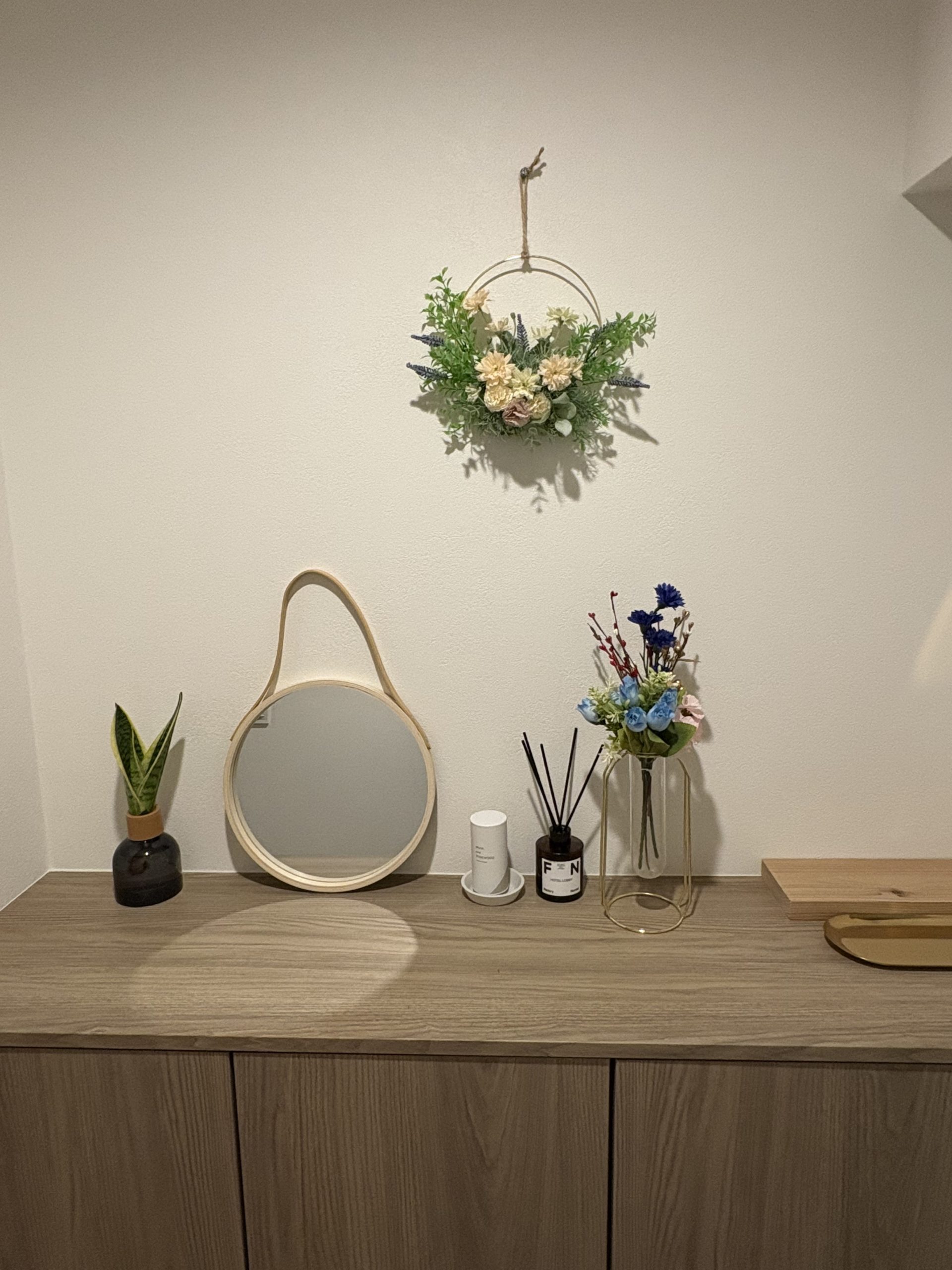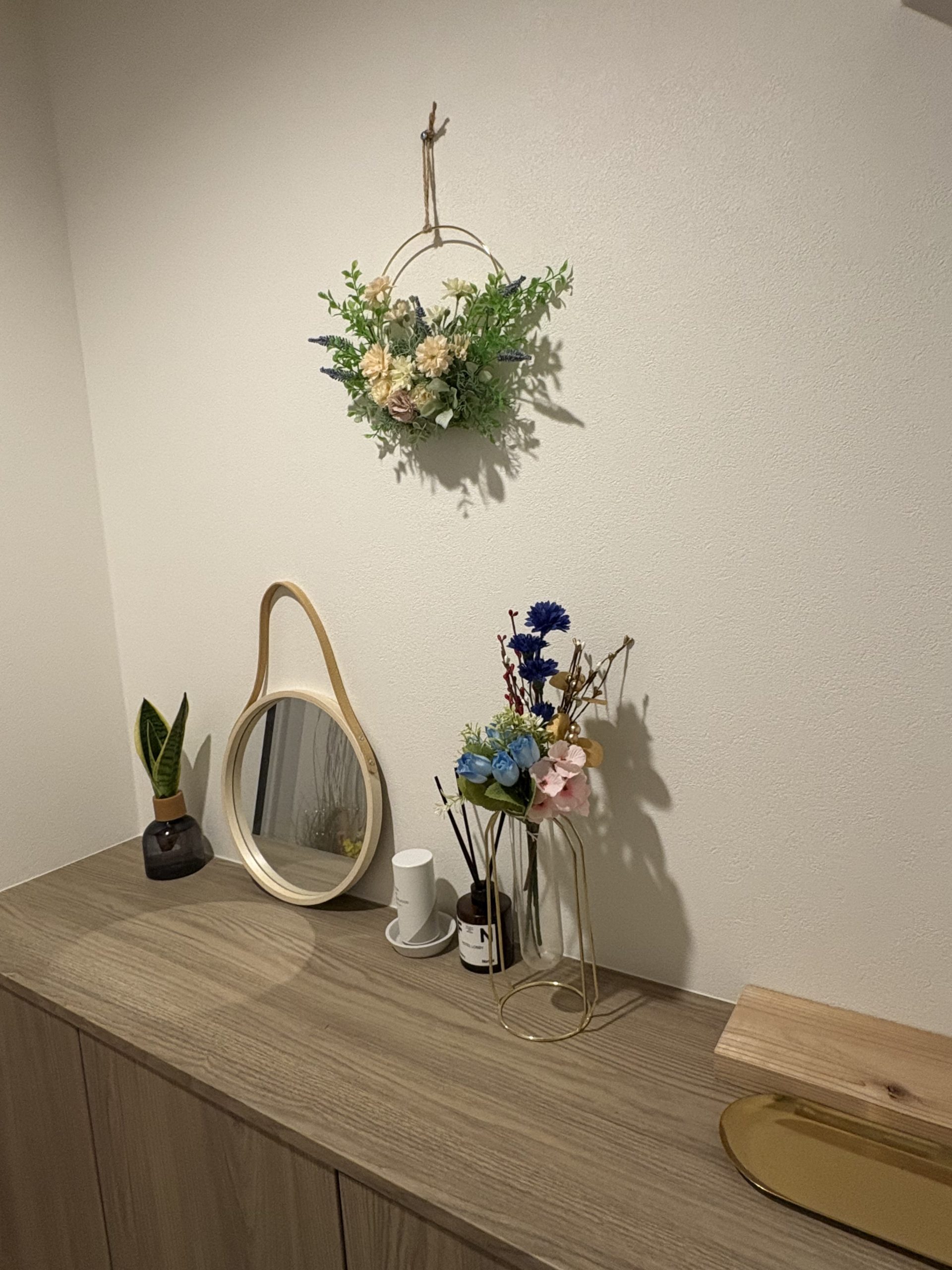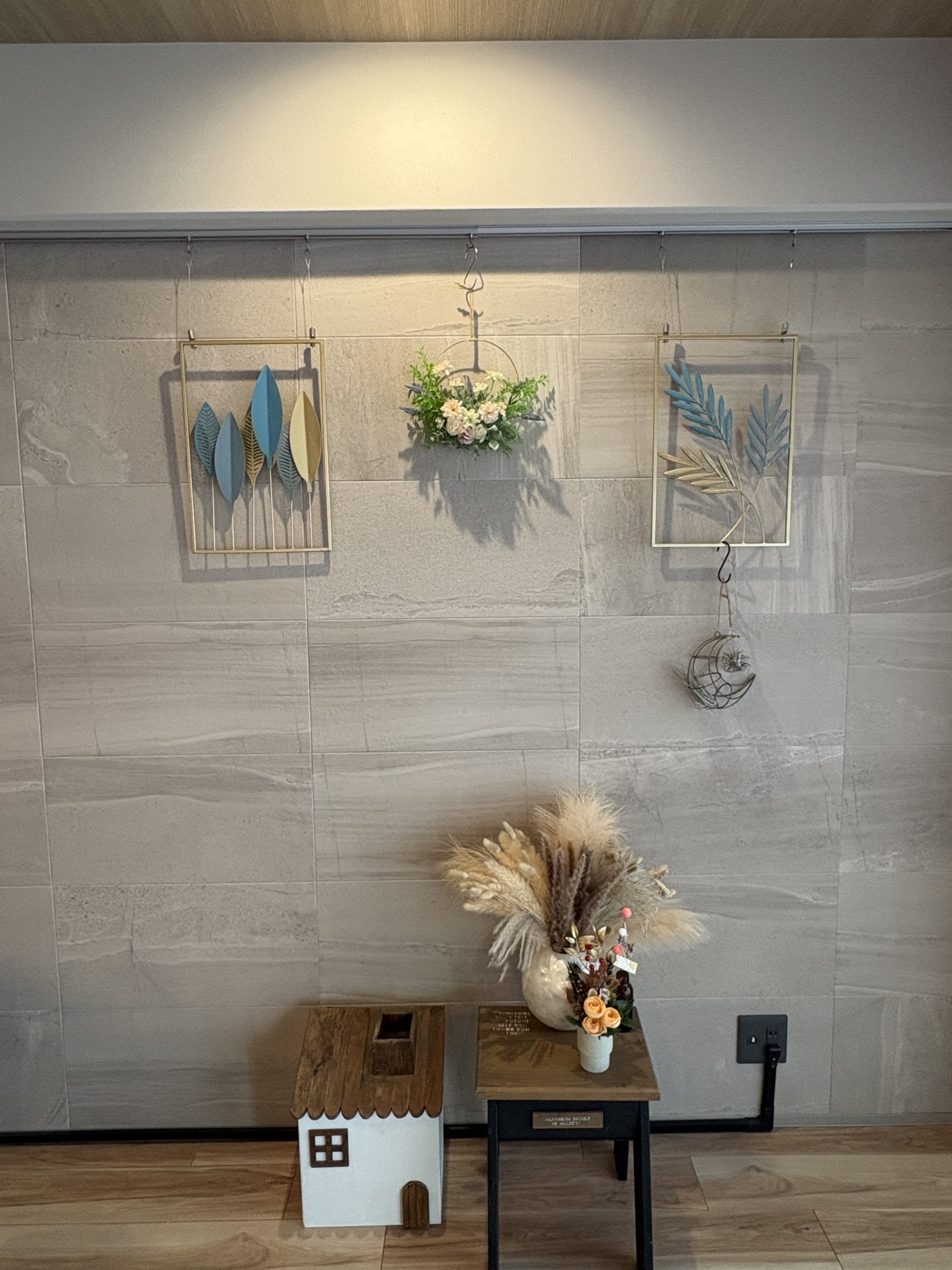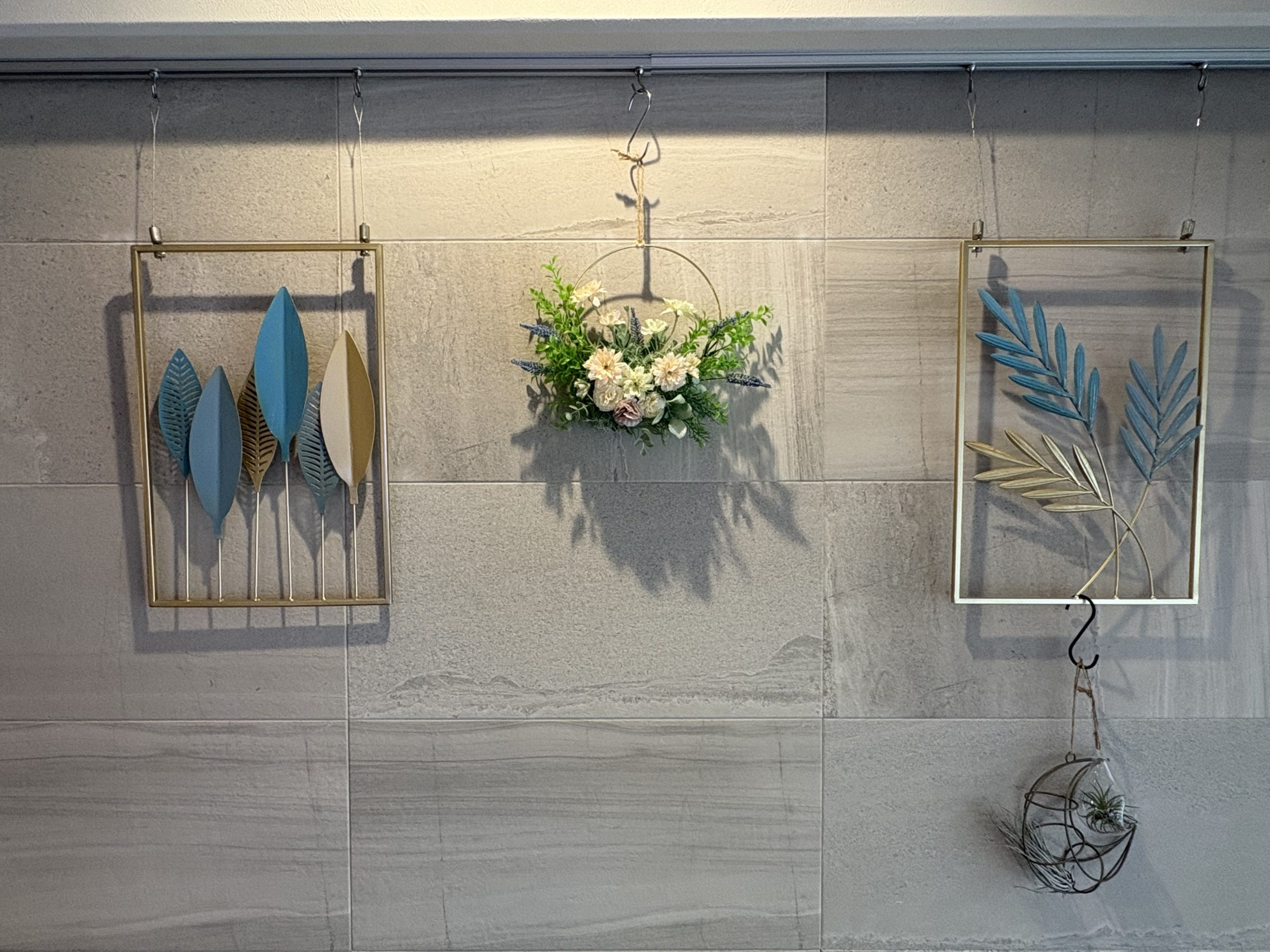 あえて余白を残したデザインは、飾る壁の質感を活かし、空間に「抜け感」と「軽やかさ」をもたらしてくれます。優しく落ち着いたトーンのピンクベージュと、繊細なパープルのアクセントが、大人のナチュラルインテリアを演出します。