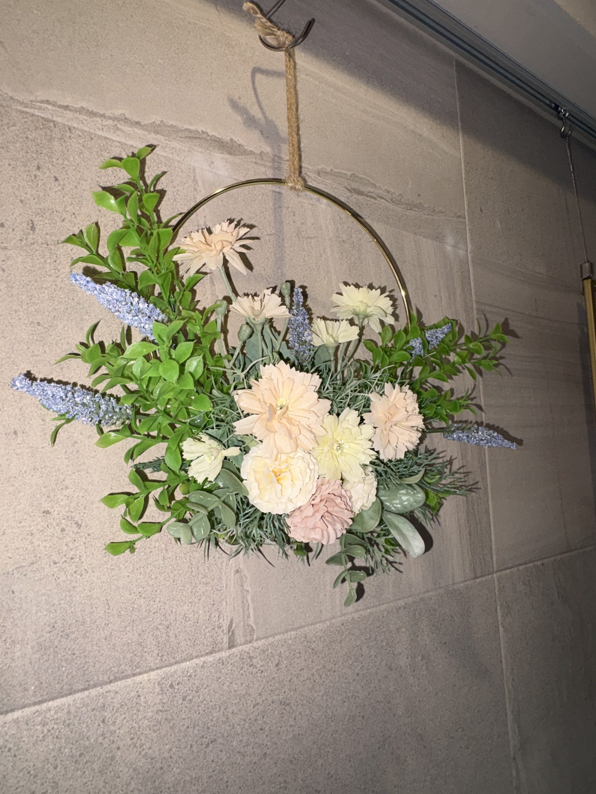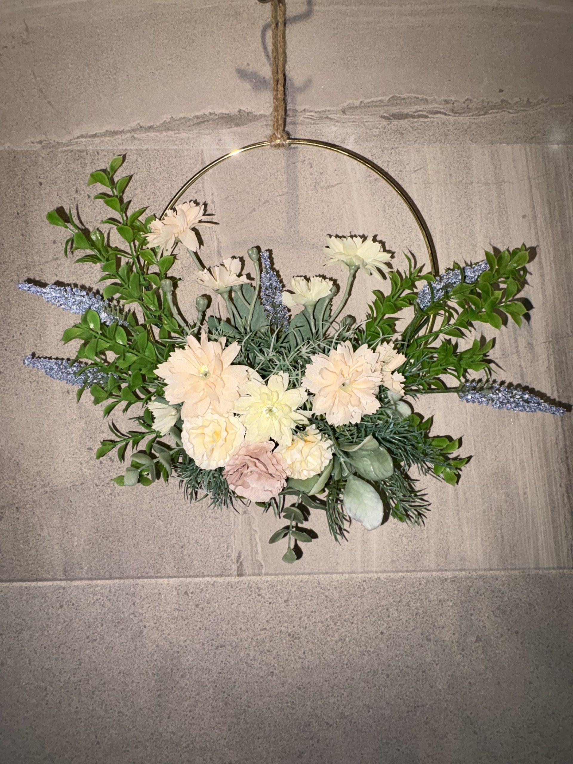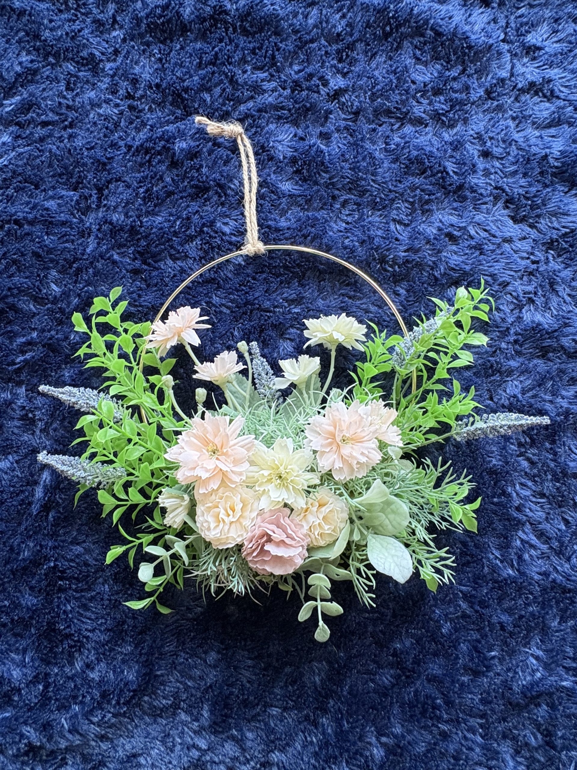 華奢なゴールドのワイヤーフレームに、ニュアンスカラーの花々と瑞々しいグリーンを贅沢に添えた、モダンなフープリースです。