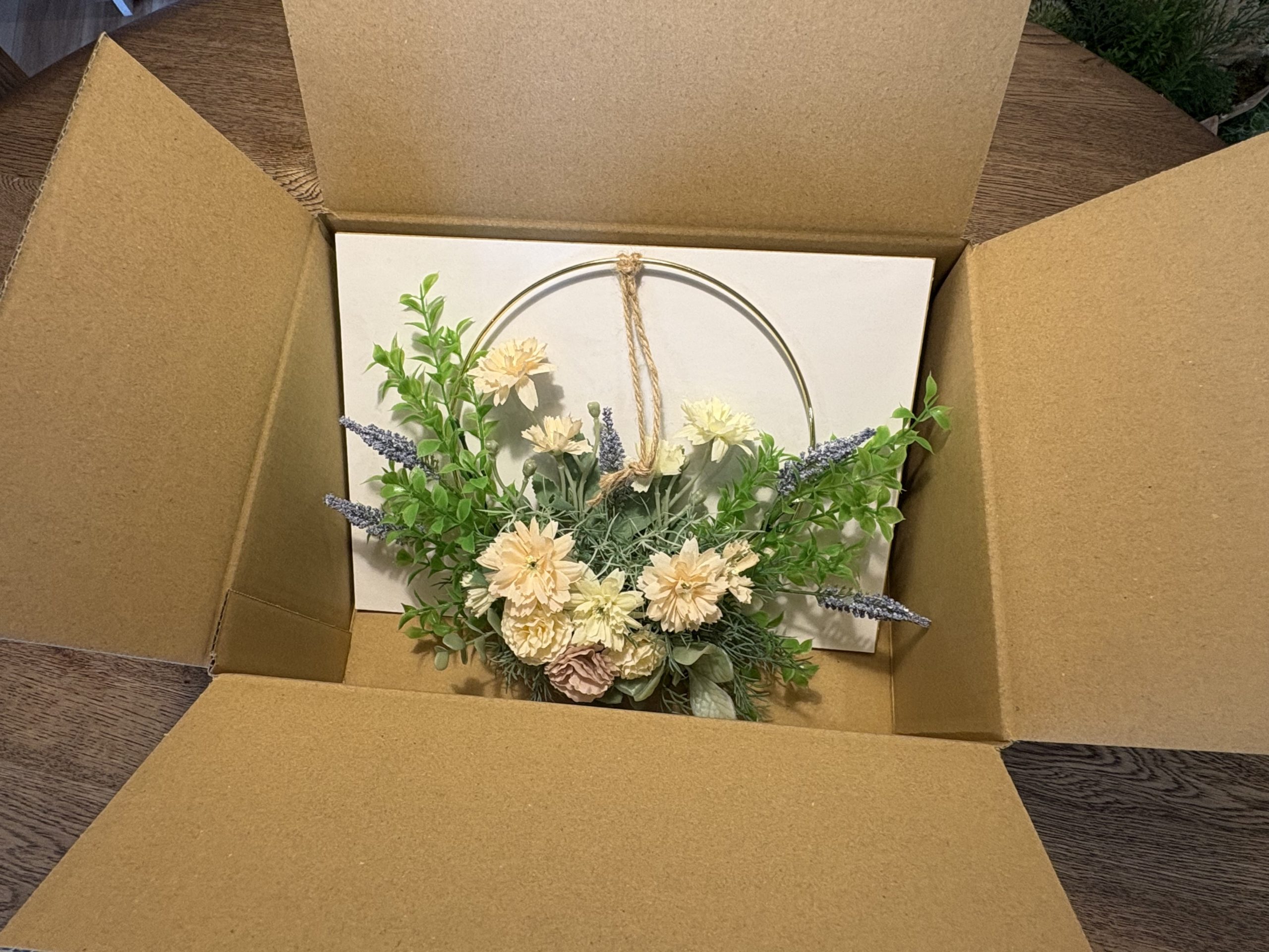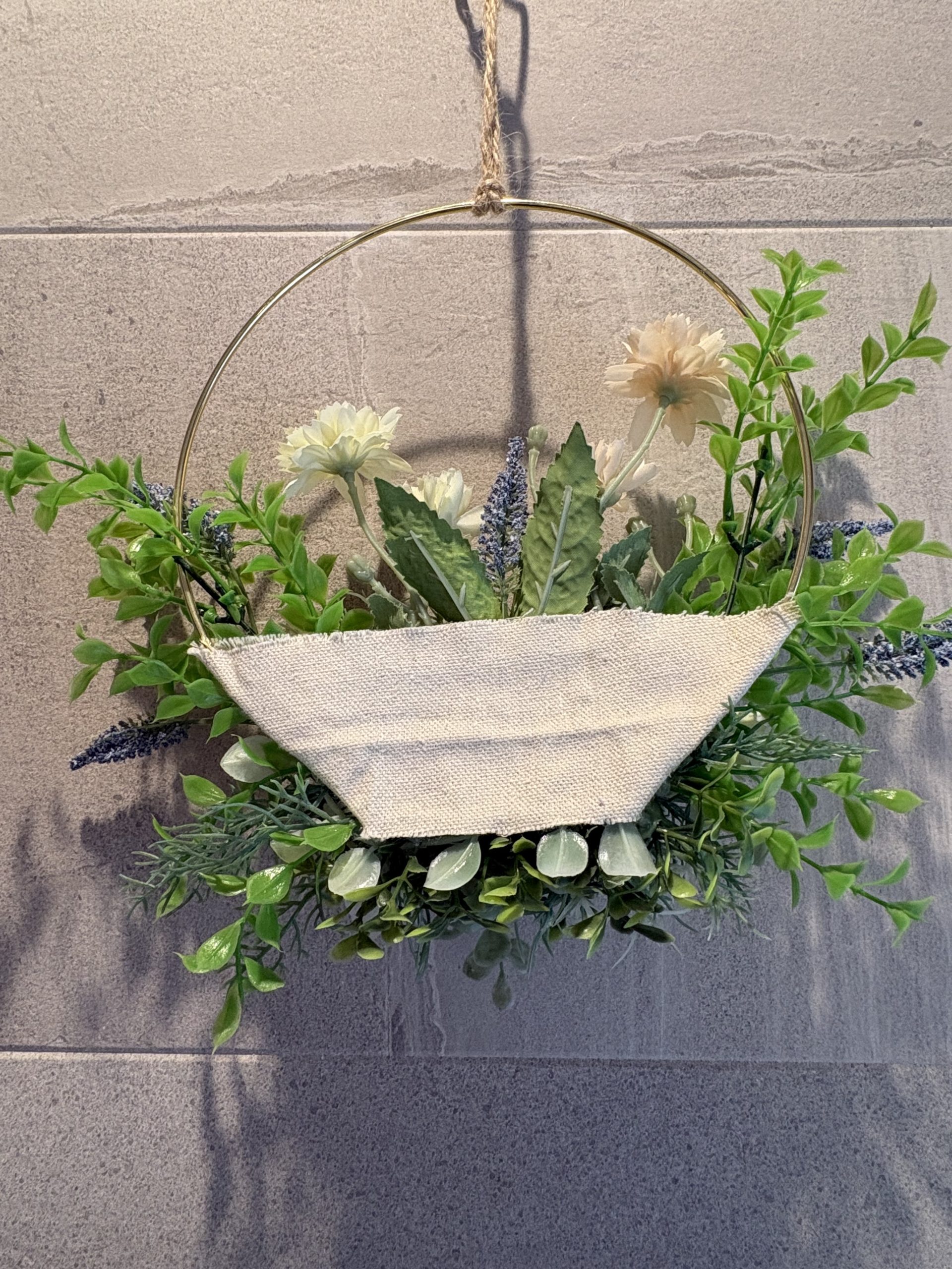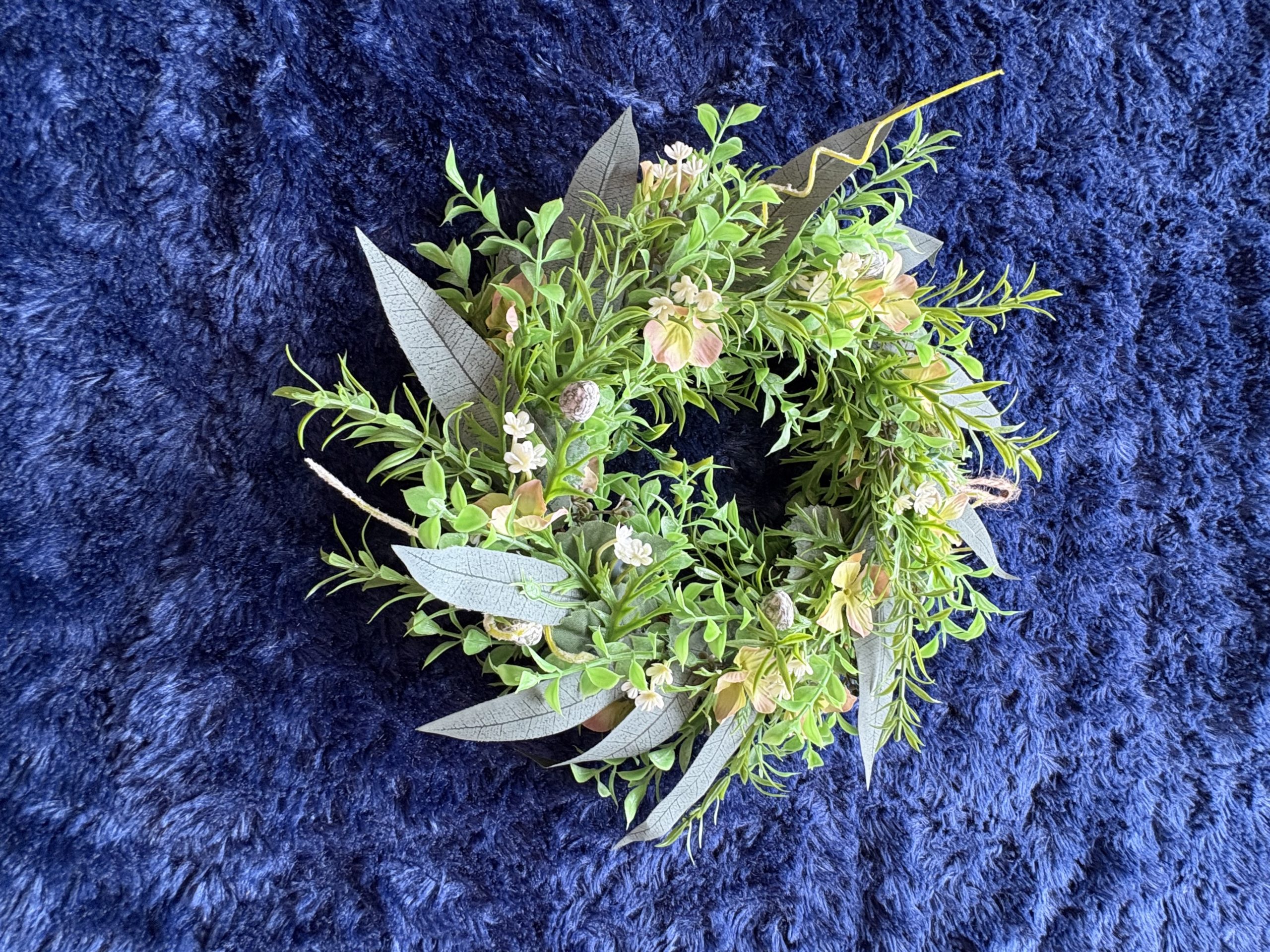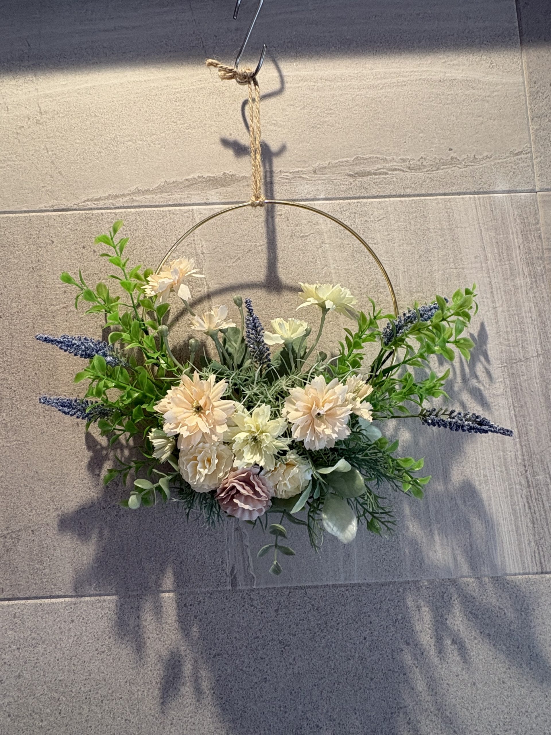 華奢なゴールドのワイヤーフレームに、ニュアンスカラーの花々と瑞々しいグリーンを贅沢に添えた、モダンなフープリースです。