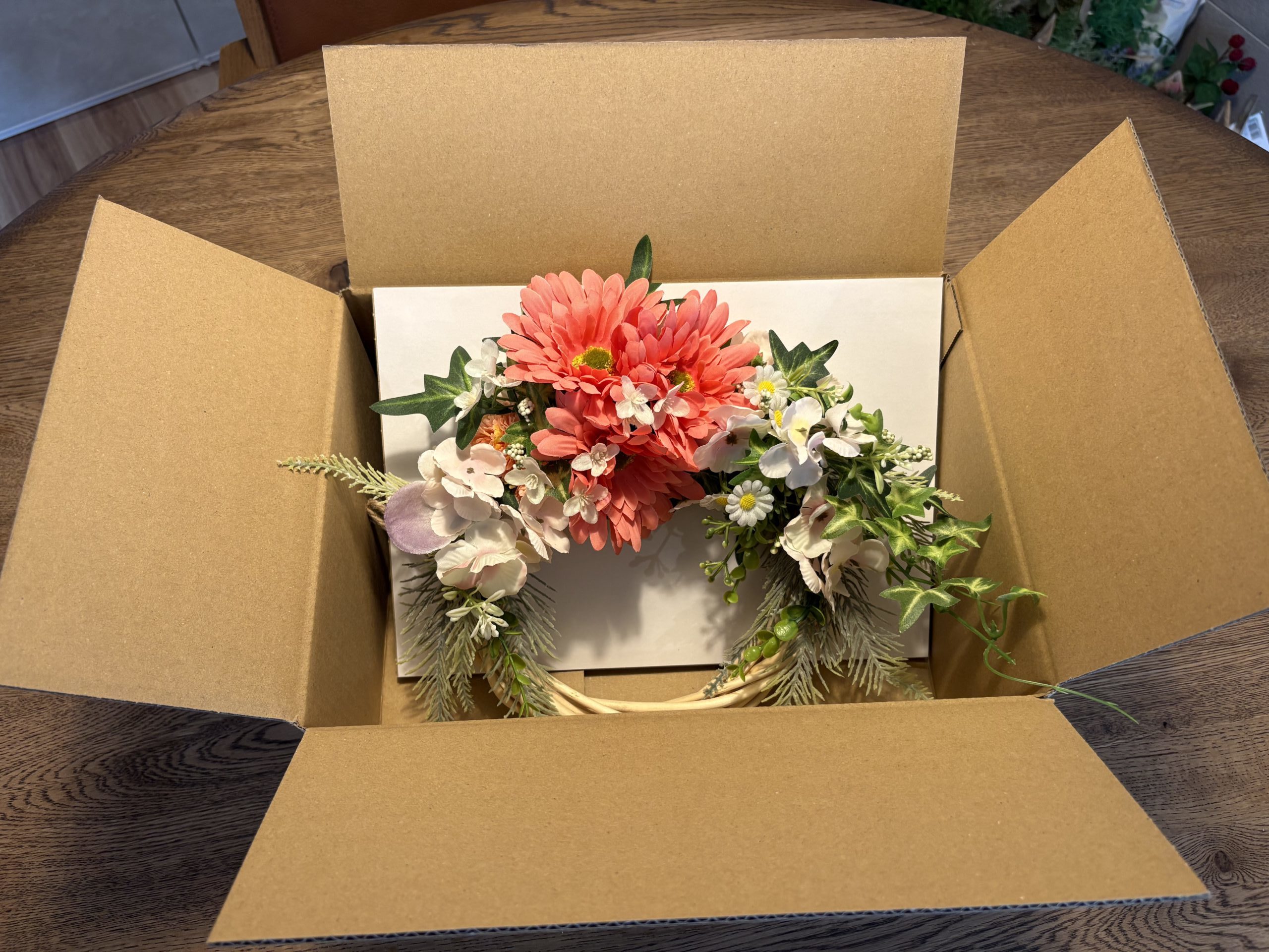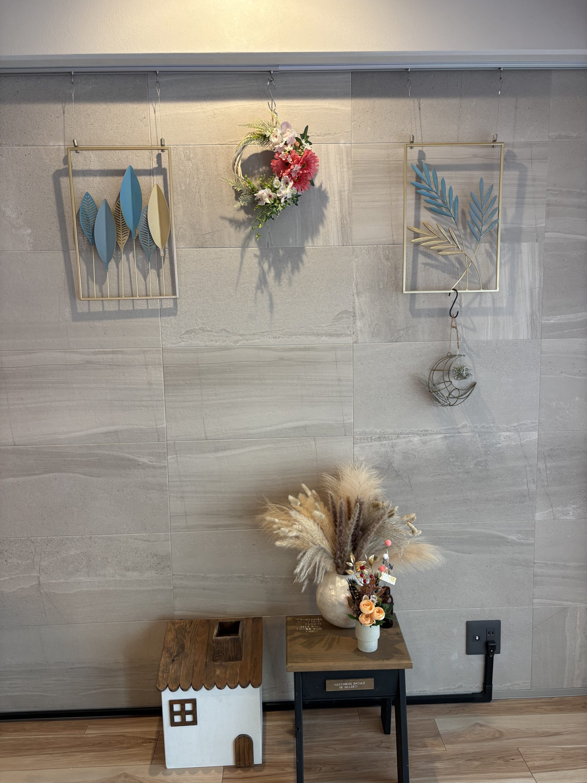 白木のナチュラルな質感を活かすことで、お花のみずみずしさと華やかさをより一層引き立てました。足元へとしなやかに伸びるアイビーが、空間に動きと爽やかな風をもたらします。