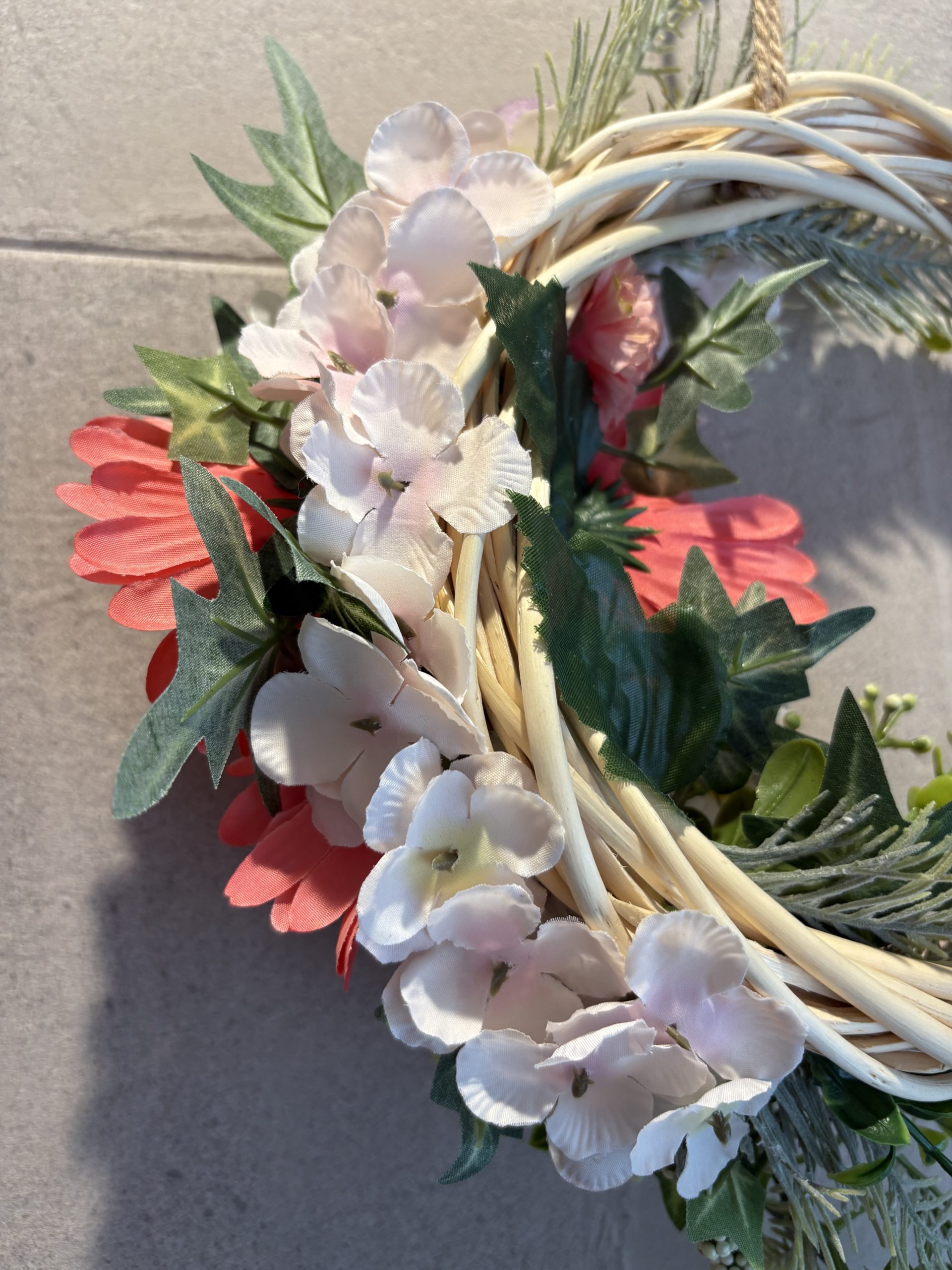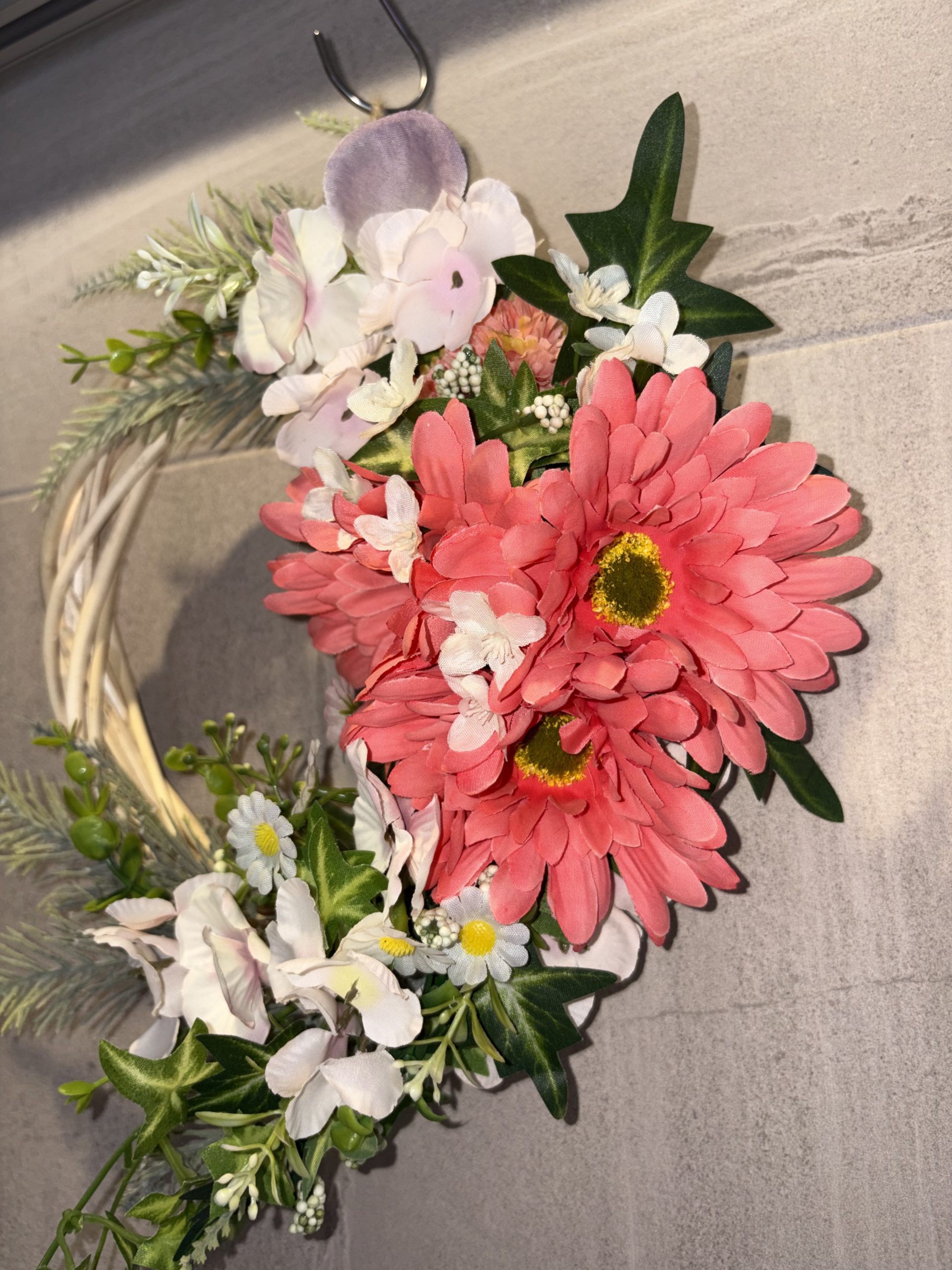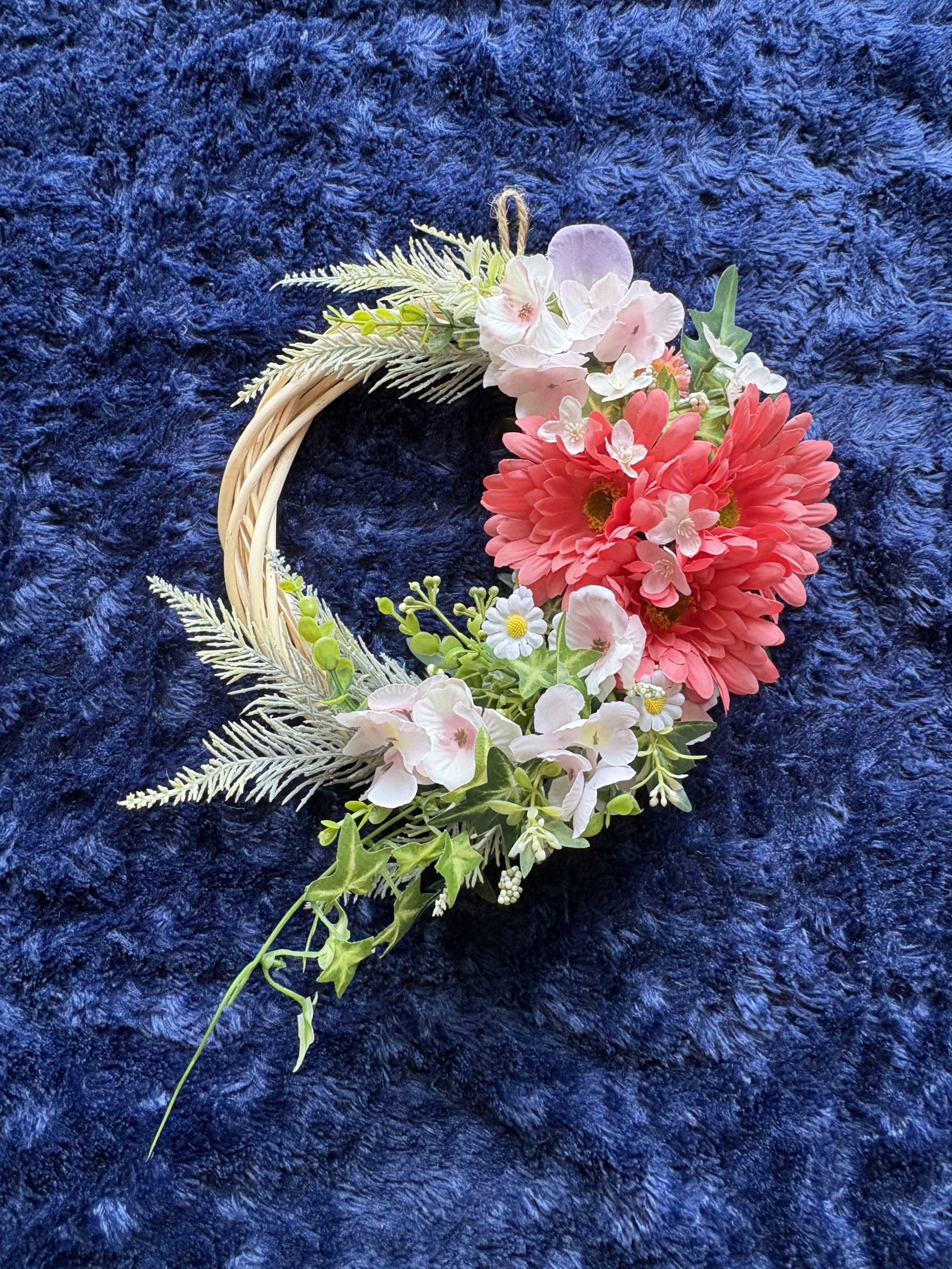 鮮やかなピンクのガーベラを主役に、可憐な小花をたっぷりと紡いだ、三日月(クレッセント)のようなシルエットのハーフリースです。